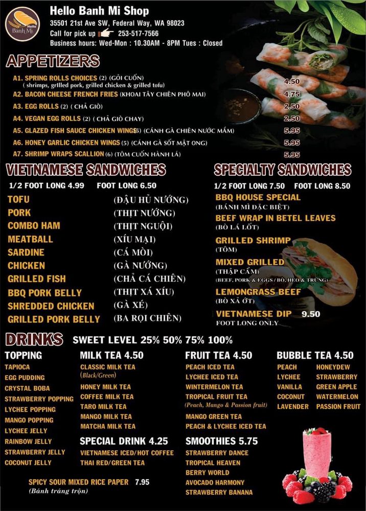 Welcome to Hi Bánh Mì, a Vietnamese sandwich haven located in Federal Way, WA! Designed for fans of bold flavors, their menu is a tapestry of delicious options. The centerpiece is, of course, the bánh mì sandwiches, celebrated for generous fillings and vibrant taste. Customers rave about the BBQ chicken and pork variants, while the lemongrass tofu option stands out as a vegan favorite.